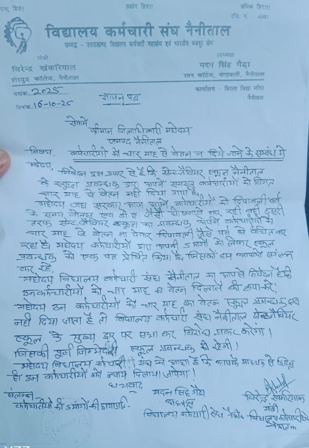 4 महीने से नहीं मिला वेतन त्यौहार के चलते कर्मचारी परेशान, विद्यायल कर्मचारी संघ द्वारा एसडीएम नैनीताल को सौंपा ज्ञापन।
